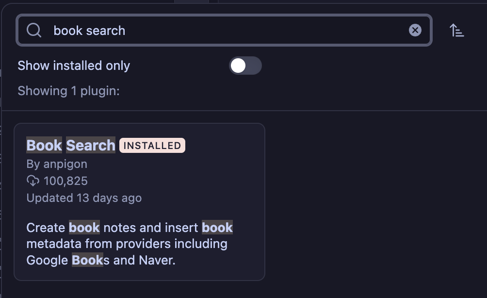'book search'로 검색하면 아래와 같은 플러그인이 보입니다. 해당 플러그인을 설치합니다.