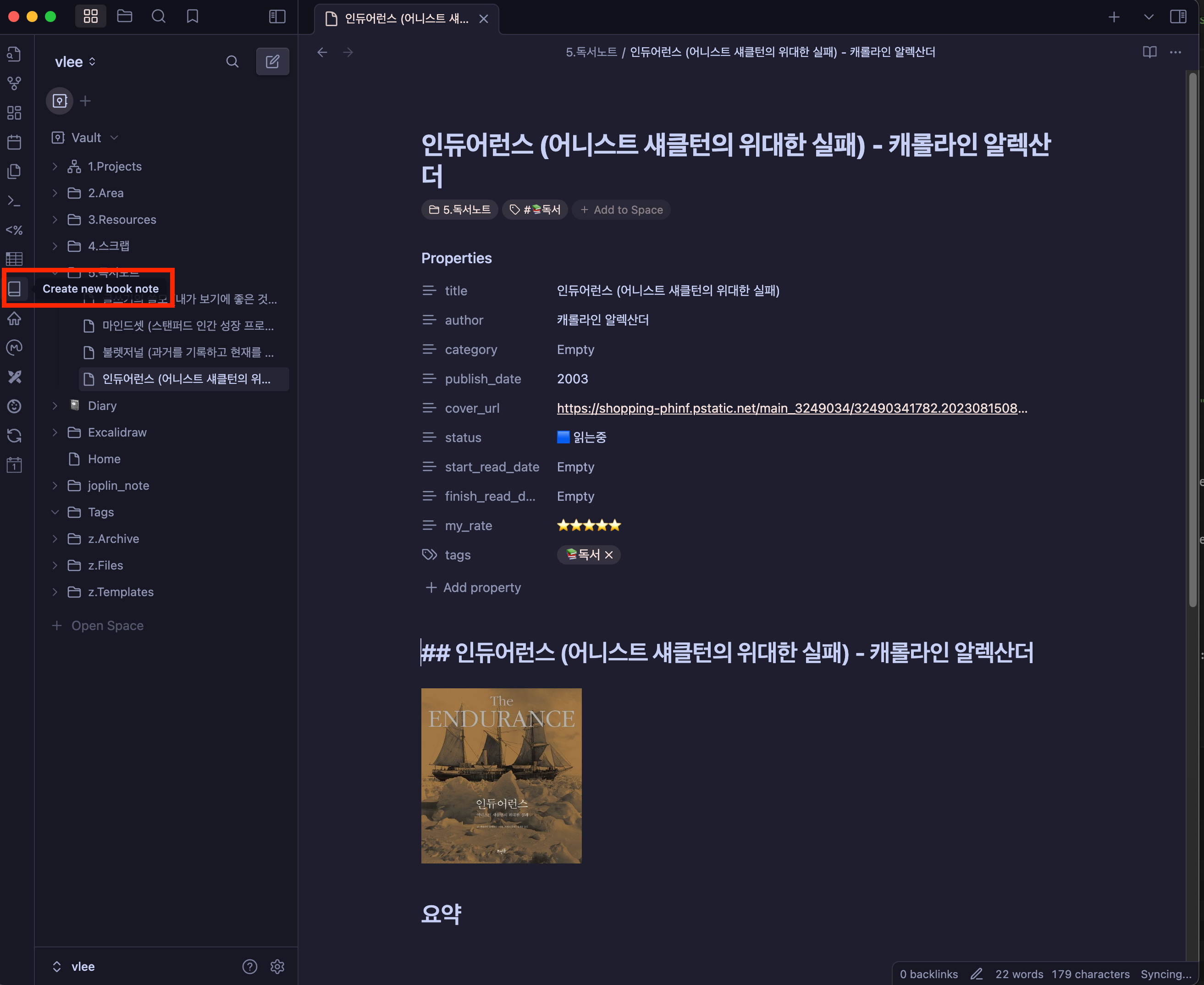 책을 선택하면 다음 캡처에서 보이는 것과 같이 본인이 선택한 책의 메타 정보들이 채워져 새로운 노트가 생성됩니다. 이 노트를 기반으로 독서노트를 작성할 수 있습니다.