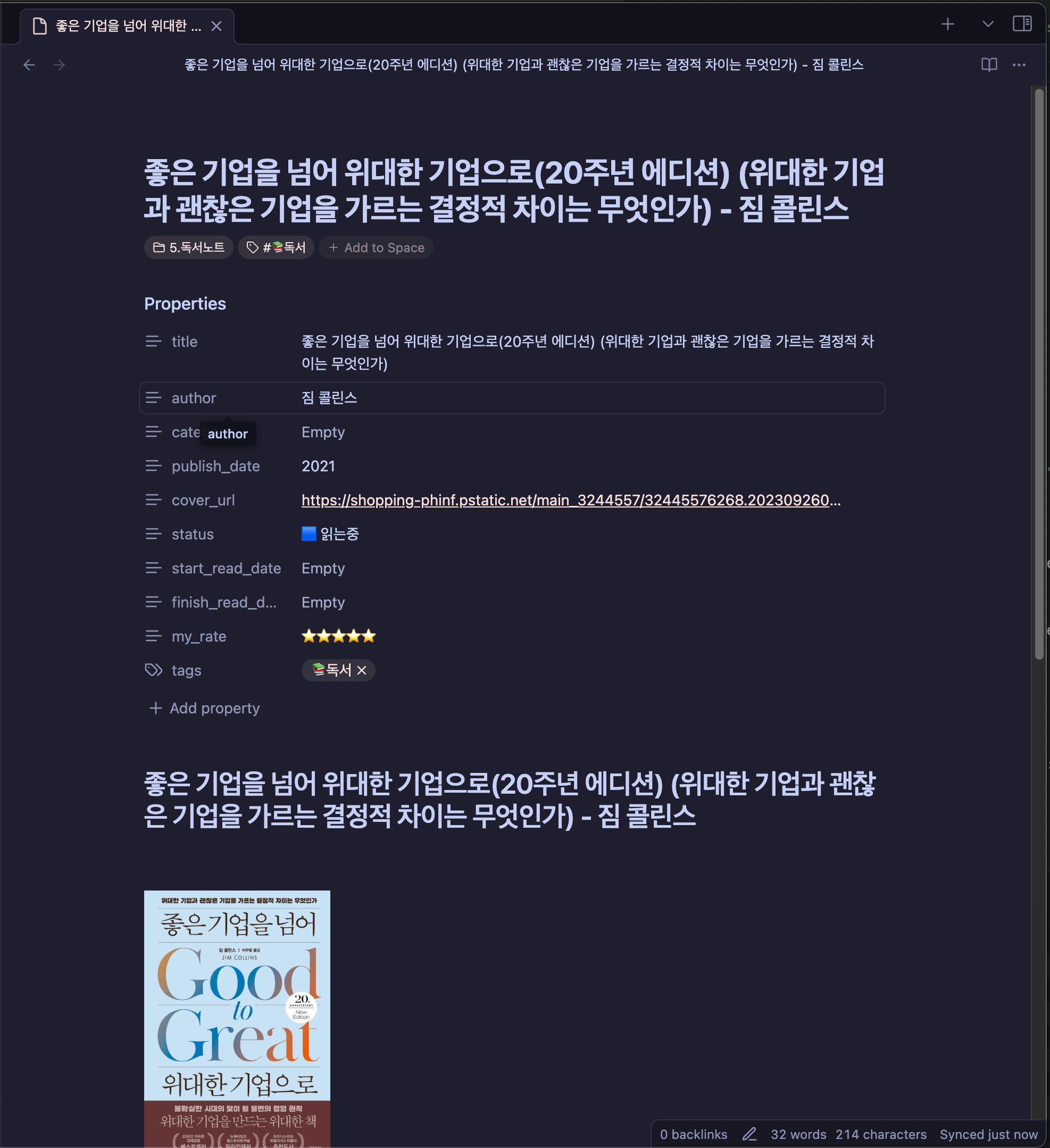 책을 선택하면 다음 캡처에서 보이는 것과 같이 본인이 선택한 책의 메타 정보들이 채워져 새로운 노트가 생성됩니다. 이 노트를 기반으로 독서노트를 작성할 수 있습니다.