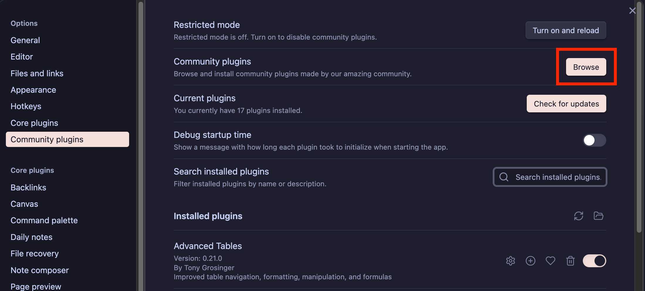 옵시디언 설정에 들어가 Community plugins를 찾아 'Browse' 버튼을 클릭합니다.