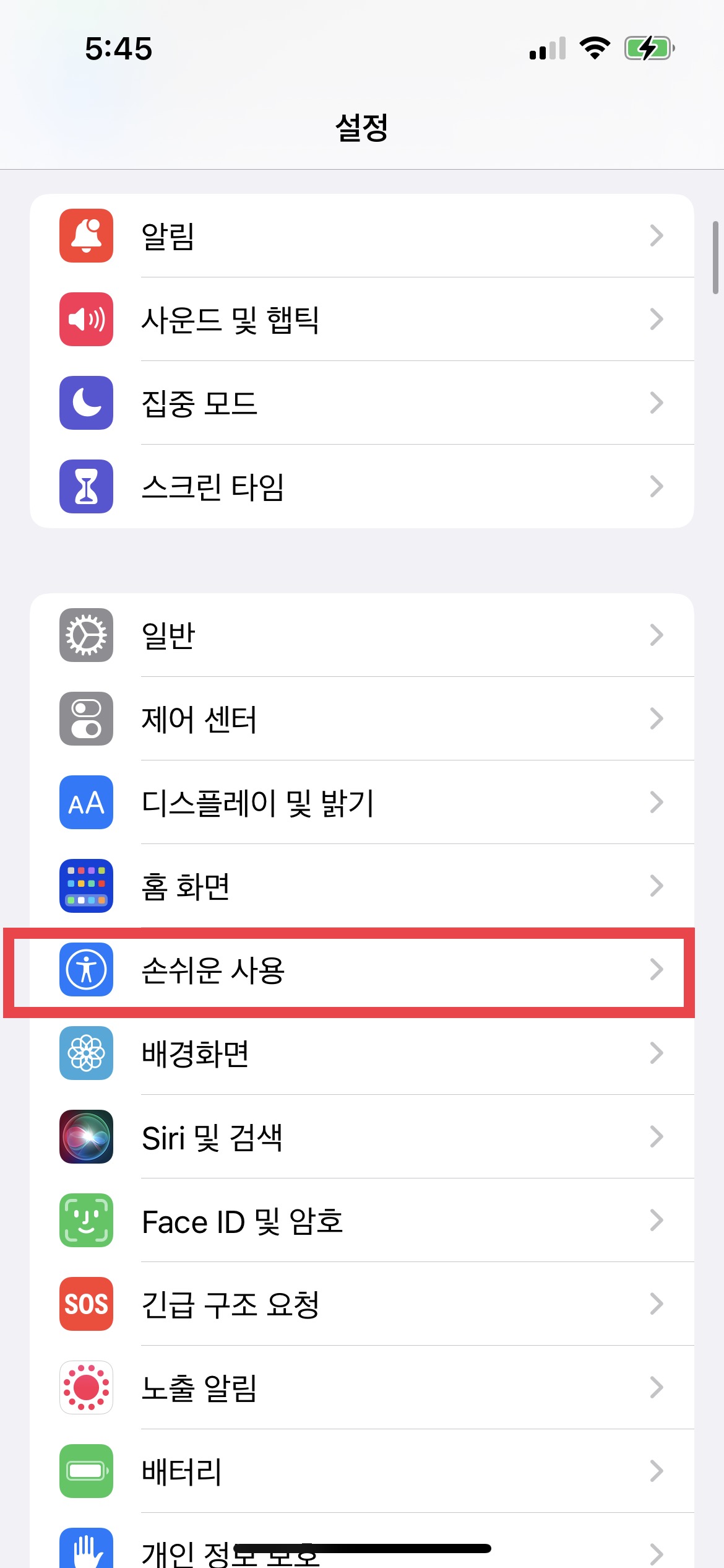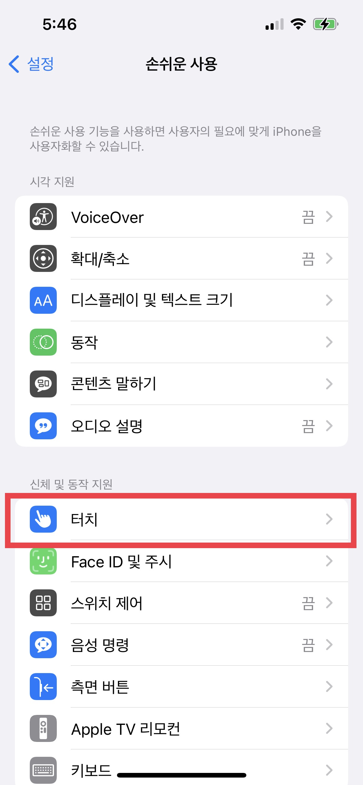 설정 -> 손쉬운 사용 -> 터치 메뉴로 들어갑니다.