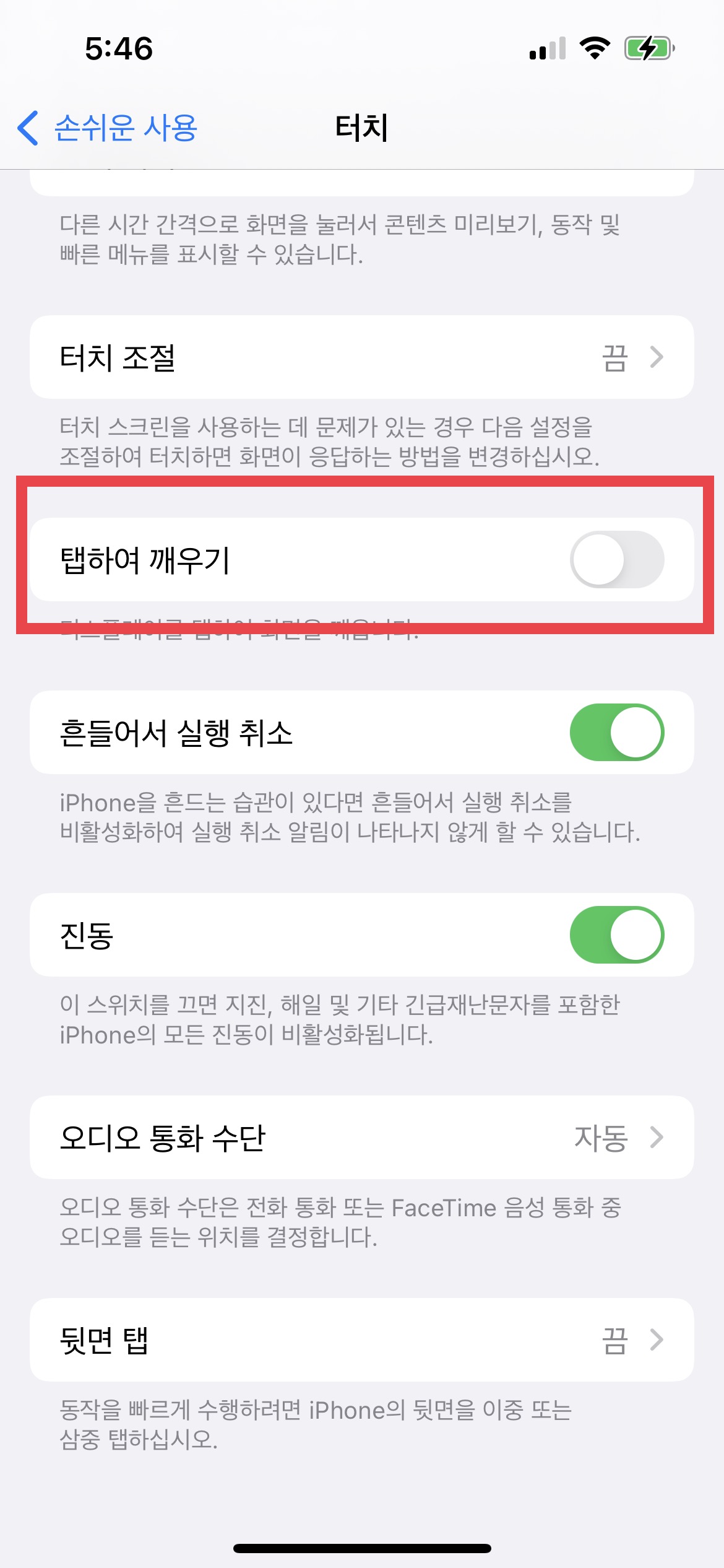 터치 메뉴에 보면 '탭하여 깨우기' 기능이 있습니다. 이 기능을 비활성화 하면 아이폰 화면을 두드려도 화면이 켜지지 않습니다.