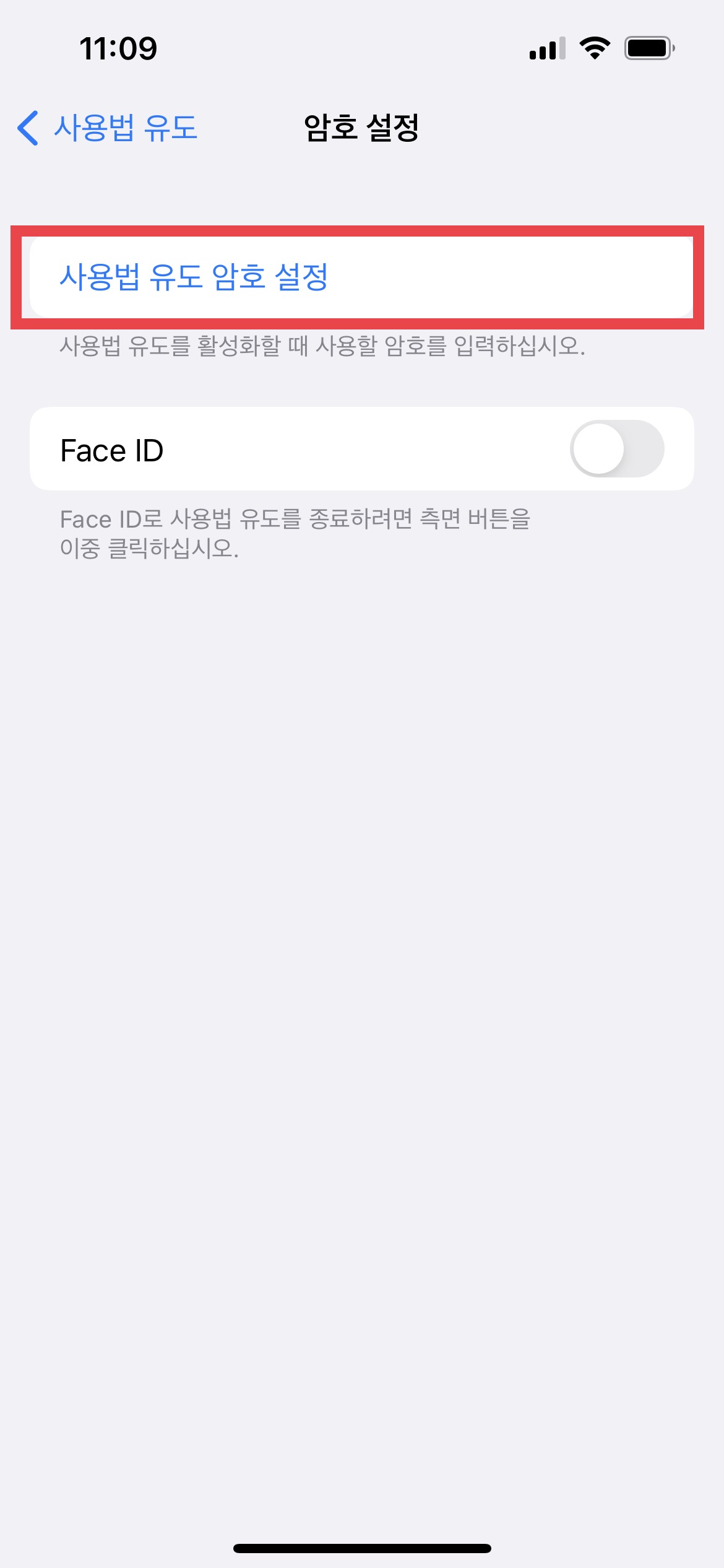 사용법 유도 기능을 활성화 하고 암호를 설정합니다. 이 암호는 사용법 유도를 종료시킬 때 사용하는 암호입니다. 아이폰/아이패드 잠금을 해제할 때 사용하는 암호와 달라도 됩니다.