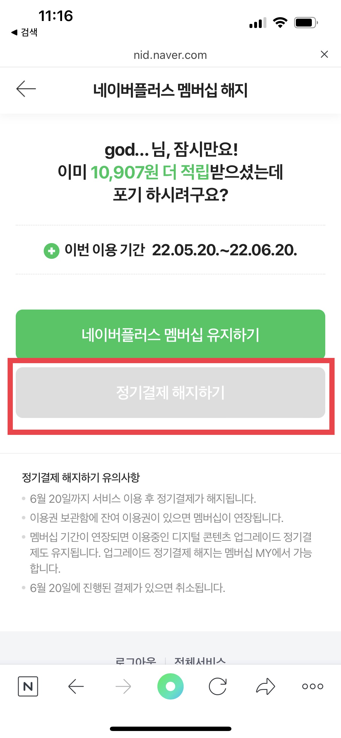 '정기결제 해지하기'를 누릅니다. 마찬가지로 색상이 회색이라 안 눌릴 것 같지만 눌립니다.
