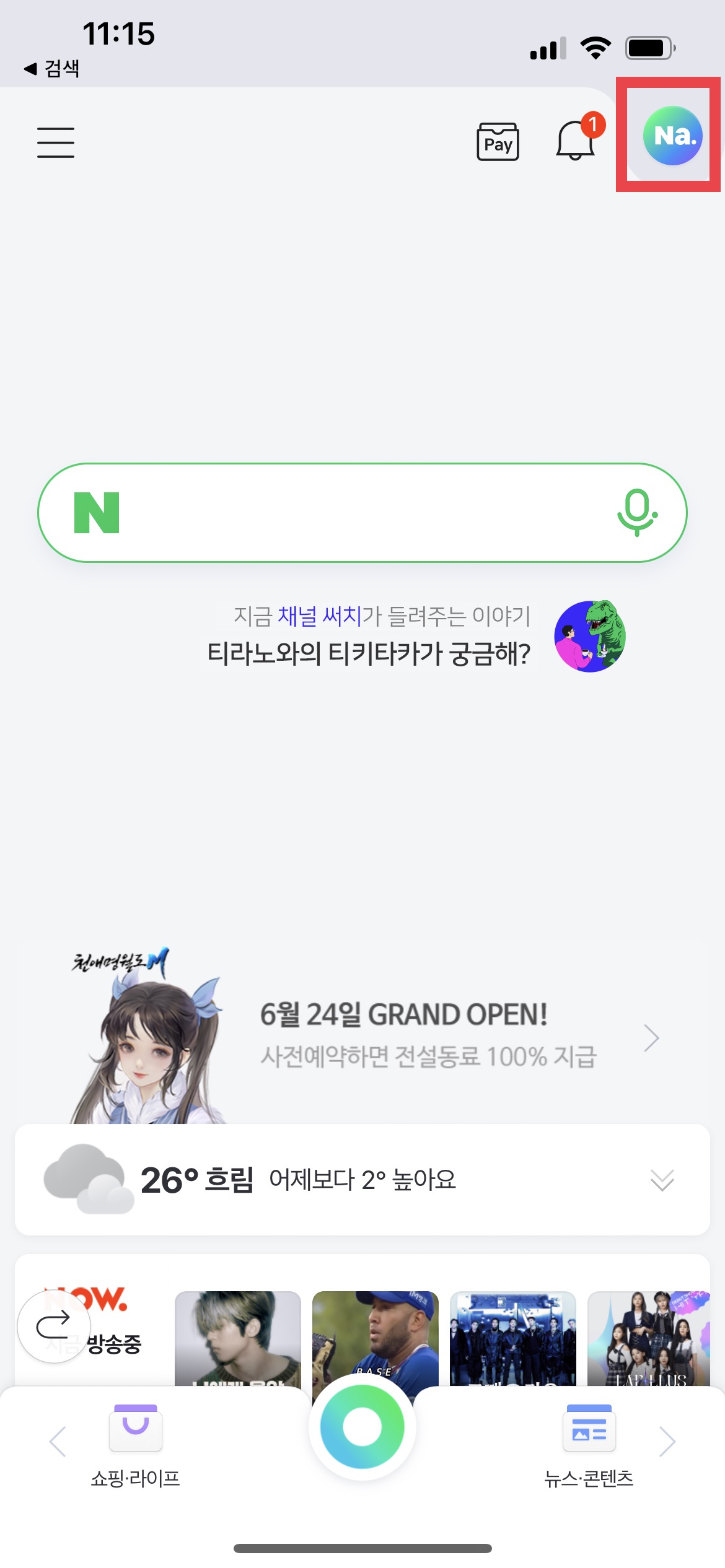네이버 메인에서 오른쪽 상단의 네이버 로고를 누릅니다.