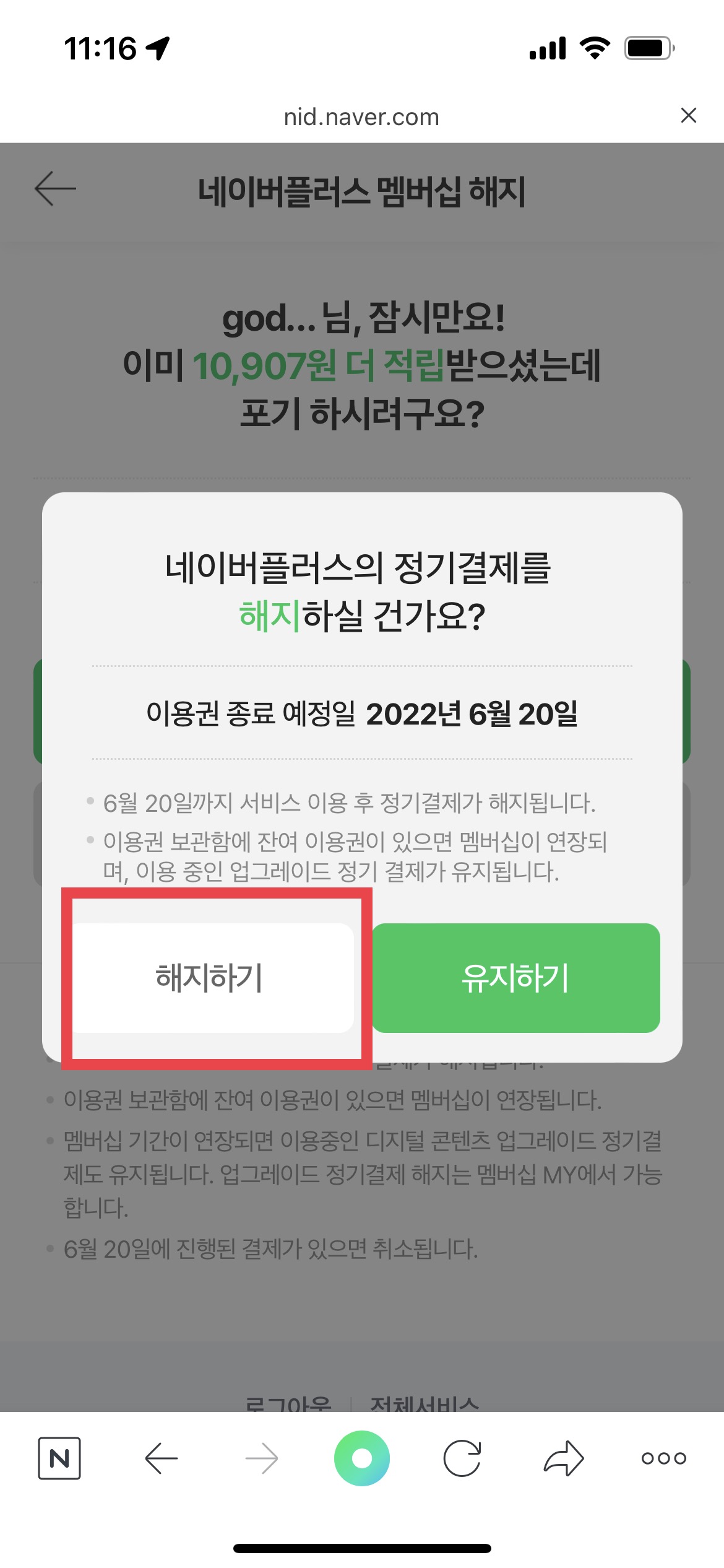 여러 유혹들을 보여줍니다. 다시 '해지하기'를 누릅니다.